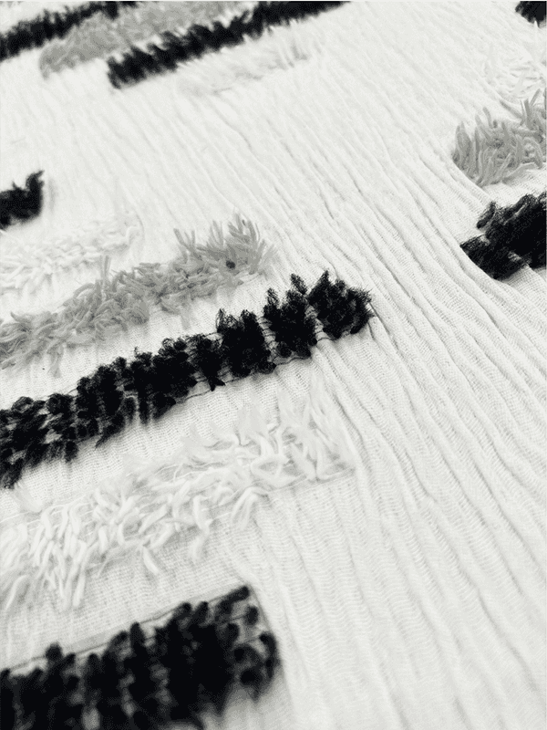 Hver blomst, sammensatt av tre forskjellige farger, er intrikat vevd inn i stoffet, og danner et likesidet firsidet mønster. Dette geometriske arrangementet gir en følelse av symmetri og balanse til det generelle designet, mens sammenvevingen av forskjellige farger skaper en visuelt fengende effekt. Bruken av tre forskjellige farger i hver blomst antyder en rik og mangfoldig fargepalett, som bidrar til stoffets iøynefallende anke. Sammenstillingen av disse fargene gir mønsteret dybde og dimensjon, og skaper en livlig og dynamisk visuell opplevelse. den sammenvevde naturen til fargene øker kompleksiteten til designet, noe som gjør det mer visuelt stimulerende og engasjerende.